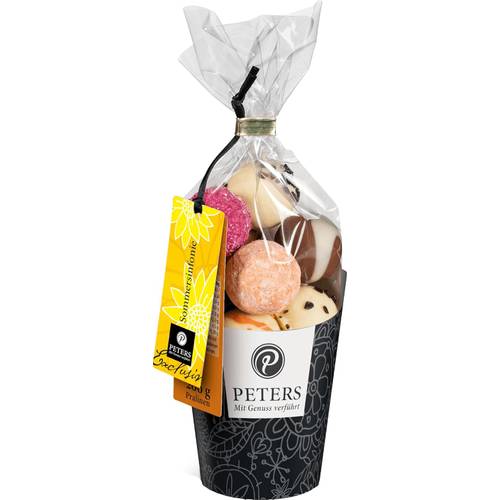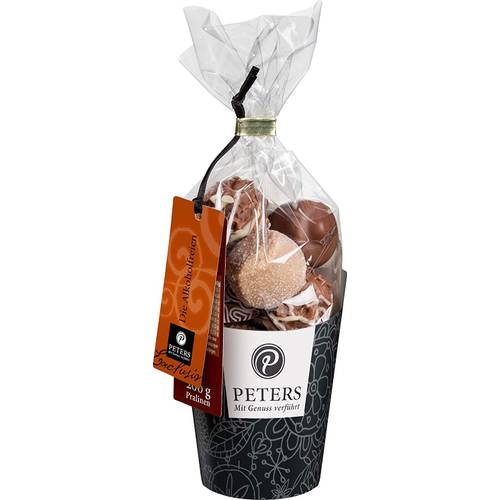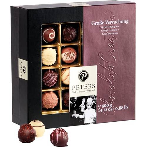 Wie diverse Peters-Pralinen-Tests online zeigen, werden die meisten Peters-Kreationen in klassischen Pralinenkästen mit jeweils 200 Gramm Inhalt angeboten. Zudem können Sie sich für kleinere 60- bis 100-g-Packungen sowie für größere Peters-Trüffel im 325-g-Format entscheiden. Für die größten Genießer werden sogar Pralinenkästen mit 950 Gramm Inhalt offeriert.