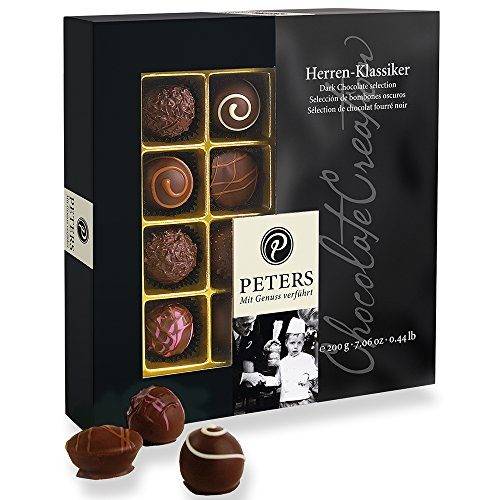 Bei den Herren-Klassikern von Peters handelt es sich um Pralinen, die eine sehr gute Qualität aufweisen und in einer 200-g-Packung aus insgesamt 16 Stücken bestehen. Was die Pralinenfüllungen angeht, handelt es sich unter anderem um Marc de Champagne, Kaffee, Pistazien-Marzipan oder die Sorte Gold. Die verwendete Zartbitterschokolade ist zudem frei von Palmöl und Palmfett. Die Herstellung und die Verpackung des Pralinenkastens erfolgen in Deutschland. Wir können die Pralinen in der ansprechenden Verpackung allen empfehlen, die die Geschmacksrichtung bevorzugen oder nach einem klassischen Geschenk suchen.