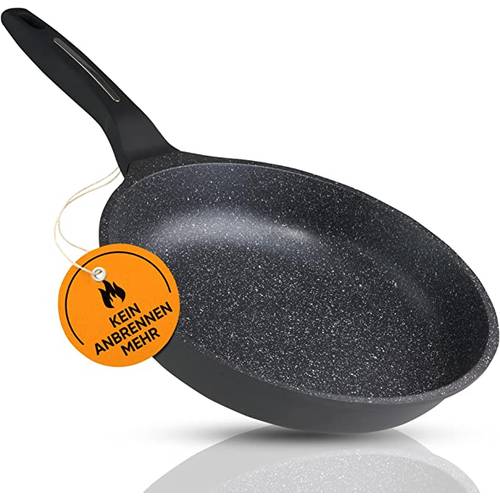 Die meisten Bratpfannen mit 28 cm Durchmesser der bekannten Hersteller wie Tefal, Fissler und Rösle eignen sich mittlerweile für alle Herdarten vom Gaskochfeld bis zum Induktionsherd. Das Spulen-Symbol auf der Rückseite des Pfannenbodens verrät Ihnen im Zweifelsfall, dass die Pfanne auch für das Kochen mit Induktion geeignet ist.