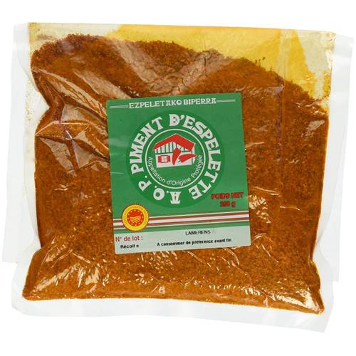 Bei diesem Elharra-Piment’d-Espelette erkennen wir am AOP-Zeichen, die rechtmäßige Nutzung der geschützten Ursprungsbezeichnung Piment’d-Espelette.