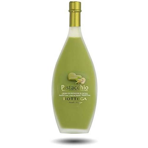 Dieses Bild zeigt und einen Bottega-Pistazienlikör, der 17 % Alkoholgehalt aufweist.