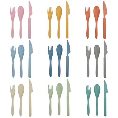Das ja!-Plastikbesteck, das uns hier gezeigt wird, enthält je sechs Gabeln, Messer und Löffel.