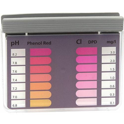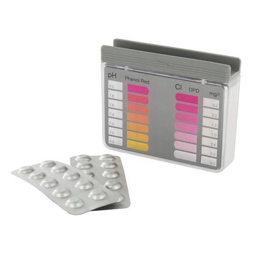 Bei diesem Steinbach-Pooltester handelt es sich um ein Testkit für pH-Wert und freies Chlor, das aus 10 Tabletten Phenol-Red + DPD1 und dem hier sichtbaren Kunststoffbehälter zur Bestimmung besteht.