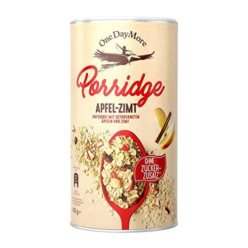 Auf der Zutatenliste dieses Dr.-Oetker-Porridges „Apfel-Zimt“ finden wir 57 % Vollkorn-Haferflocken, Magermilchpulver, 14 % getrocknete Apfelstücke, 4,6 % Agavendicksaftpulver, Stärke, Zimt und Aroma.