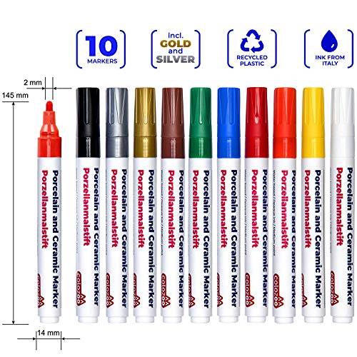 Möchten Sie Porzellanstifte kaufen, kommen diese meist in verschiedenen Sets. Mit einer Stückzahl zwischen 10 und 28 Stiften gibt es dabei eine hohe Auswahl an Farben. Die beliebtesten Farben der Porzellanstifte sind Gold und Silber, jedoch sind auch Porzellanstifte in Schwarz sehr praktisch für Konturen und Schriftzüge.