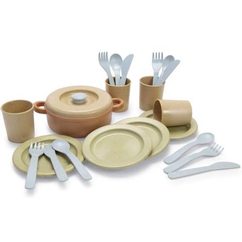 Essgeschirr umfasst Teller, Schüsseln und Besteck, teilweise ergänzt durch Trinkbecher oder kleine Töpfe. Ein solches Puppengeschirr-Set ist besonders gut für die Kinderküche oder Puppenküche geeignet. Es unterstützt Kinder darin, Alltagssituationen nachzuspielen, sei es beim Servieren eines imaginären Frühstücks oder beim Picknick im Garten.