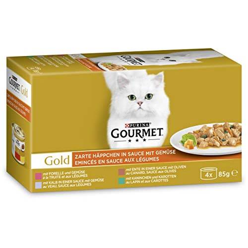 Das Katzenfutter Gourmet von Purina gibt es in unterschiedlichen Geschmacksrichtungen, hauptsächlich Huhn, Rind und Fisch sind enthalten.
