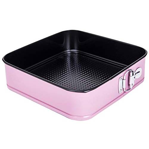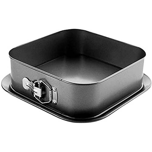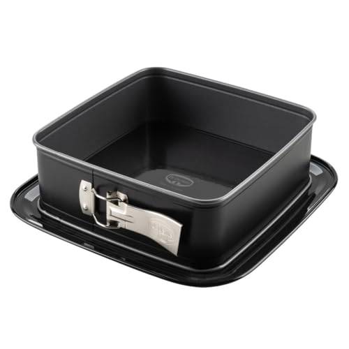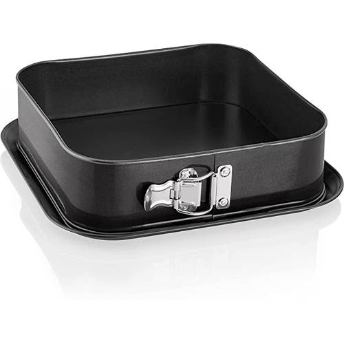 Die Springform besteht aus zwei nicht zusammenhängenden Teilen: einem flachen Boden und einem verstellbaren Außenrand. Aus der quadratischen Springform lassen sich die Kuchen durch die Antihaftbeschichtung auch ohne Einfetten leicht herauslösen. Durch den Spannhebel am Außenrand kann die Form gelockert werden, wodurch man diese vom Kuchen lösen kann. Nehmen Sie den Außenrand nach oben hin ab; der Boden bleibt unter dem Kuchen, sodass dieser sofort serviert werden kann.