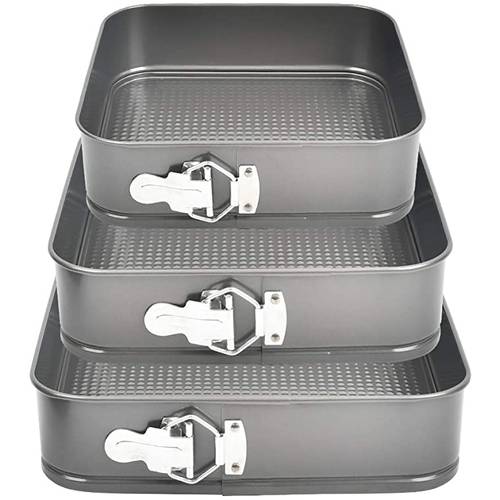 Die quadratische Springbackform hat vier gleichlange Seiten, damit der Kuchen quadratisch wird. Es gibt sie in verschiedenen Größen. Wer mit der Springform flexibel sein möchte, findet auch verstellbare quadratische Backformen, die sich auf die gewünschte Größe einstellen lassen.