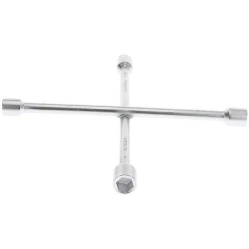 Ein Radkreuzschlüssel ist in der Regel länger als ein herkömmlicher Schlüssel, da er auf die größeren Muttern und Schrauben abgestimmt ist. Die meisten Radkreuzschlüssel haben eine abgewinkelte Spitze, um den Schlüssel besser ansetzen zu können.