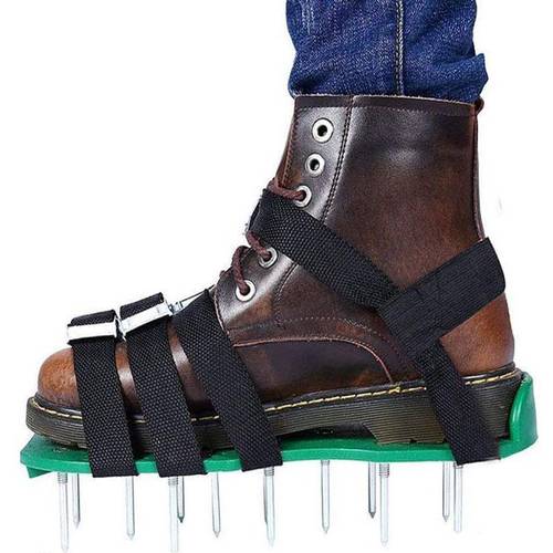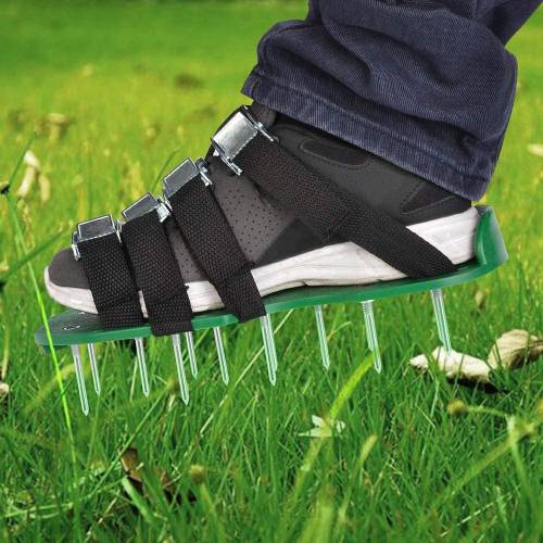 Diese Nagelschuhe für den Garten funktionieren wie Vertikutierer: Sie laufen mit den Schuhen gleichmäßig Ihren Rasen ab. Dabei teilen Sie die Fläche in horizontale und vertikale Reihen ein.