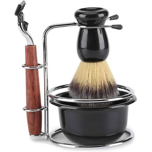Auf diesem Bild sehen wir ein 4-teiliges Nom-Rasierpinsel-Set, das aus Pinsel, Rasierhobel und einem Halter mit Schale besteht.