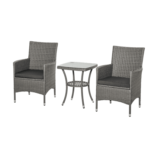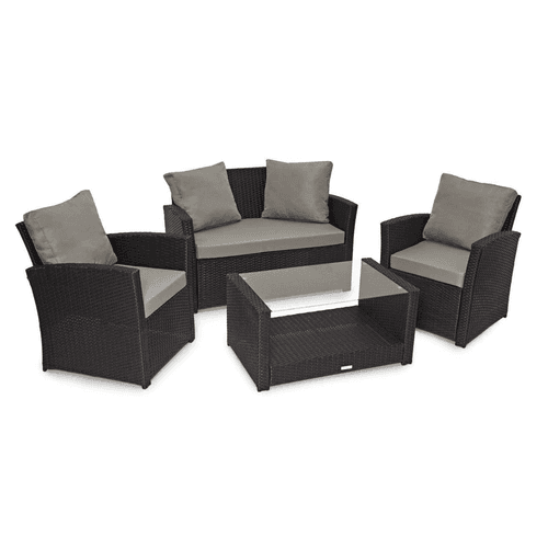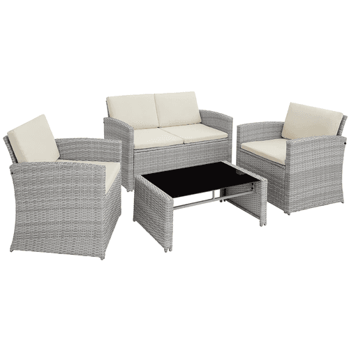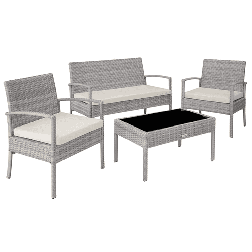 Zum Rattan-Gartenmöbel-Set gehört ein flacher Tisch mit Glasplatte, der dekorativ und pflegeleicht zugleich ist, wie wir bemerken.