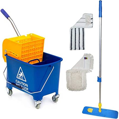 Außerdem sind viele Putzwagen mit sinnvollen Details ausgestattet: Dazu gehört beispielsweise eine Halterung für Müllsäcke, sodass man den Inhalt von Abfalleimern schnell entsorgen kann. Auch die Mopp-Presse ist bei Reinigungswagen eine gute Ergänzung, denn damit entfällt das mühevolle Auswringen per Hand. Diese Presse wird oft in Kombination mit zwei Eimern für das Wischwasser angeboten. In den einen gelangt dann das Schmutzwasser, im anderen bleibt das Wasser sauber.