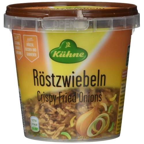 Kaufen Sie Röstzwiebeln am besten in einer wiederverschließbaren Dose oder füllen Sie die Zwiebeln zu Hause in ein wiederverschließbares Glas oder eine Tupperdose um.