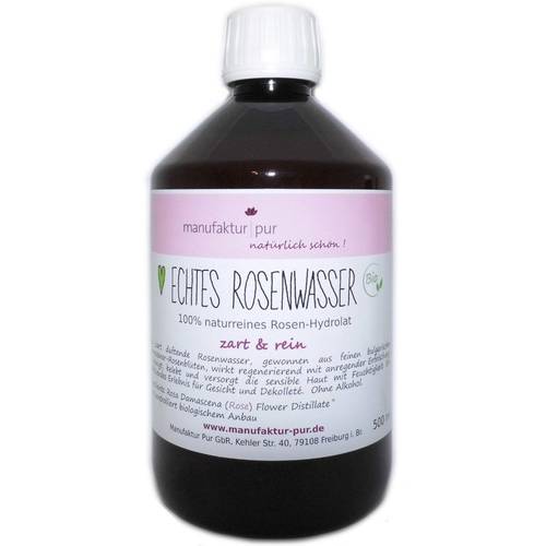 Das Rosenwasser selber entsteht als Nebenprodukt bei der Herstellung von Rosenöl. Rosenwasser wird durch die Destillation der Blütenblätter der Rosa Damascena gewonnen. Für 1 Liter Rosenöl benötigt man 4 Tonnen Rosenblätter. Durch einen Trennprozess von Rosenöl und -wasser, der Wasserdampfdestillation, wird das kostbare Rosenwasser gewonnen. Dieses wird auch als Hydrolat, genauer gesagt als Rosenhydrolat, bezeichnet.