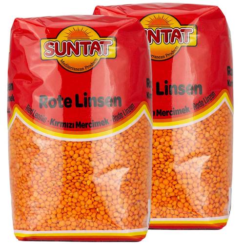 Hier wird uns eine 500-g-Packung von Suntat-Rote-Linsen gezeigt – eine Marke, die türkische Lebensmittel anbietet.