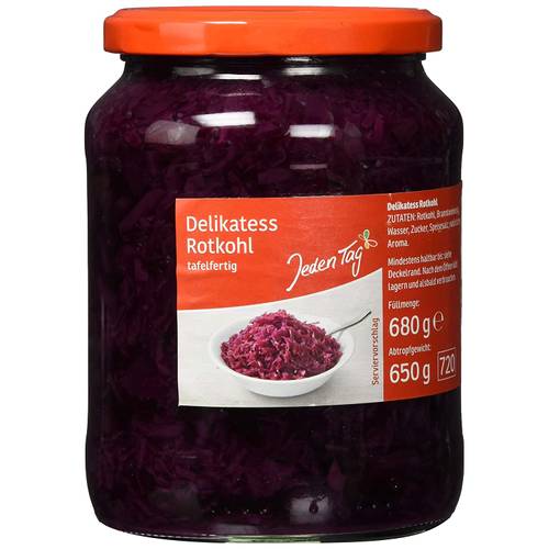 Rotkohl (zum Beispiel von Freshona) wird oft im Glas verkauft und besitzt einen praktischen Drehverschluss, der sich leicht öffnen lässt.