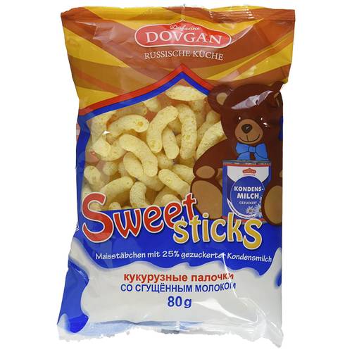Auf der Zutatenliste dieser russische Süssigkeiten von Dovgan stehen nur Zucker, Glukosesirup, Magermilchpulver, Butter und Vanillearoma.