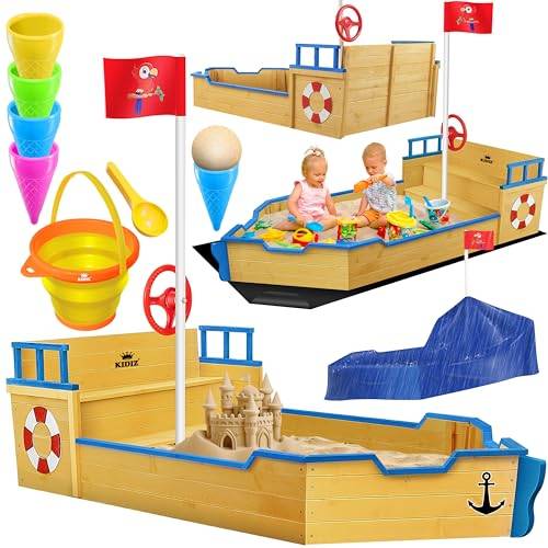 Extras | einklappbarer Sonnenschutz, Steuerrad zwei zudeckbare Kisten | zwei herausnehmbare Innenkästen aus Kunststoff | Sitzbank, Wasserwanne, Staufach | Matschküche, einklappbarer Sonnenschutz | Fahnenmast, Steuerrad | Fahnenmast, Steuerrad , Speicherplatz | ||