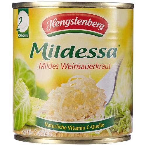 Auf diesem Bild wird uns ein Hengstenberg-Sauerkraut gezeigt, das für die schnelle Zubereitung in der Mikrowelle gedacht ist.