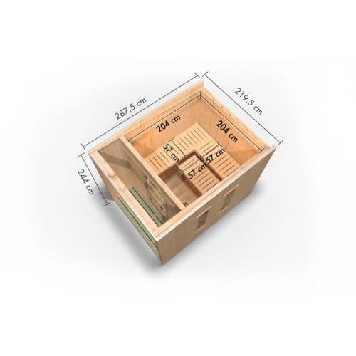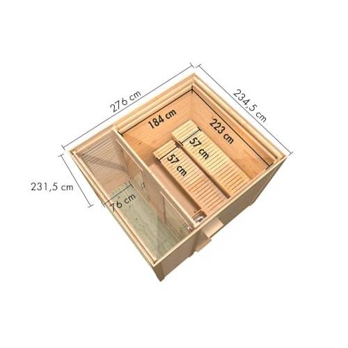 | Raumaufteilung | Sauna 219 x 184, Rest Vorraum | Sauna mit überdachter Terrasse | Sauna mit überdachter Terrasse | Sauna 220 x 220 cm, Rest Vorraum | Sauna mit überdachter Terrasse 76 cm tief | nur Sauna | nur Sauna | nur Sauna |