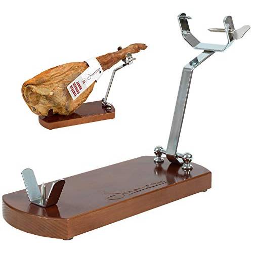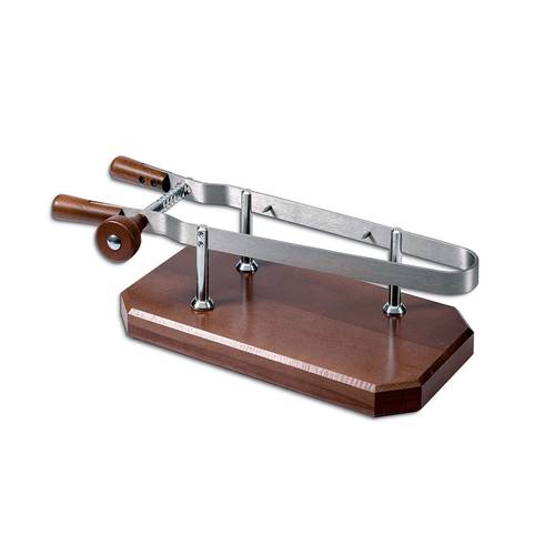 Um einen Schinken im Halter zu befestigen, wird die Schinkenkeule mit der Fettseite nach oben auf den Halter gesetzt und stabil fixiert. Dies erfolgt mit einer Schraube, einem Riegel oder einem verstellbaren Arm. Es ist wichtig, die Keule so zu positionieren, dass die schneidbare Fläche gut zugänglich ist.