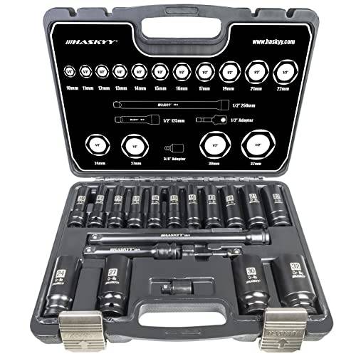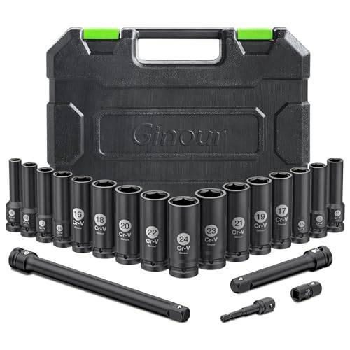 Lange Steckschlüssel Nuss: Die Schlagschrauber-Nüsse langer Machart werden verwendet, um Muttern zu erreichen, die auf Bolzen befestigt sind, deren Gewinde zu lang sind, um von den flachen Stecknüssen erreicht zu werden. Sie sind in der Regel 78 bis 85 mm lang und können sich somit problemlos über freiliegende, lange Gewinden bis hin zur Mutter bewegen, um diese zu lösen oder anzuziehen.