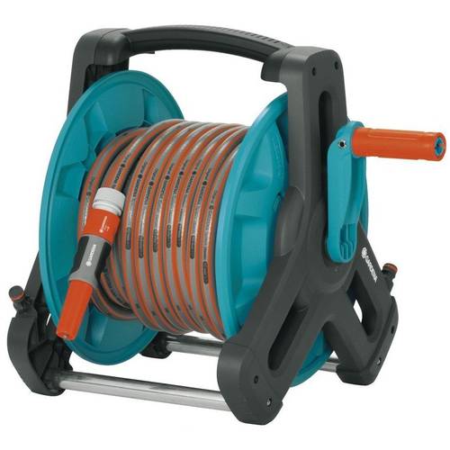 Schlauchtrommel | Schlauchtrommeln, wie die Gardena Classic Comfort, sind geschlossene Geräte, der Gartenschlauch verschwindet in ihrem Inneren. Sie werden oft, wie die Schlauchalter an die Wand montiert. Eine Schlauchtrommel ist ähnlich wie der Schlauchwagen aufgebaut. Zudem besitzen sie abgewinkelte Anschlüsse für den Wasserschlauch. Durch diese wird effektiv ein Verdrehen oder Abknicken des Schlauchs verhindert. |