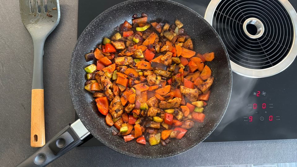 Sobald wir das Gemüse (Zucchini, Karotten und Paprika) hinzufügen, brät auch dieses rasch mit. Allerdings müssen wir häufiger wenden, um gleichmäßige Ergebnisse zu erzielen. Die Antihaftbeschichtung funktioniert dabei gut. Ein Deckel ist nicht im Lieferumfang der Schmorpfanne, sodass wir das Gemüse und Fleisch nur offen weiter schmoren können. Hierfür schalten wir die Temperatur auf Stufe 5 von 9. Nach etwa fünf Minuten erreichen die Möhren bereits eine bissfeste Konsistenz. Nach weiteren drei bis vier Minuten sind sie passend gegart. Insgesamt benötigt unser Pfannengericht aufgrund des fehlenden Deckels etwas mehr Zeit.