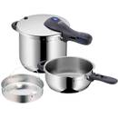 Ein Schnellkochtopf-2er-Set besteht aus einem Dampfkochtopf und einer Schnellbratpfanne. Bei der Schnellbratpfanne handelt es sich im Wesentlichen um einen flachen, kleinen Schnellkochtopf, in dem Fleisch oder Fisch auch angebraten und gewendet werden kann. Mit dem Deckel des Schnellkochtopfes wird die Pfanne beziehungsweise der niedrige Schnellkochtopf dann zur Schnellbratpfanne.