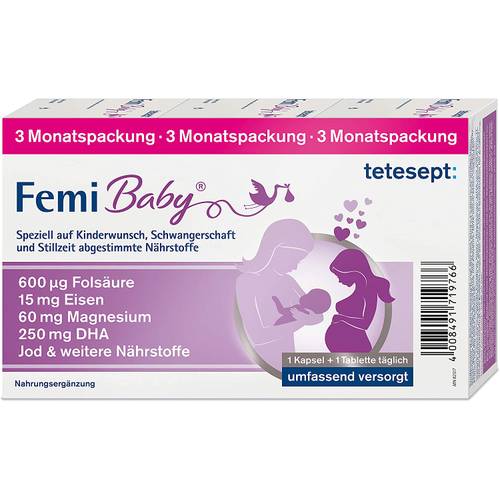 Bei den tetesept-Schwangerschaftsvitaminen „Femi Baby“ enthält jede Packung einen Monatsbedarf, wie wir erfahren.