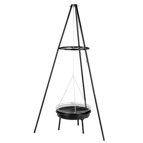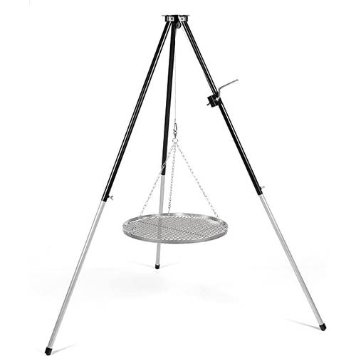 Der Dreibein-Schwenkgrill besteht aus drei Stangen, die an ihrem Scheitelpunkt zusammengeführt werden und an einer Kette den Grillrost in der Mitte tragen. Diese Modelle sind einfach zu transportieren und lassen sich auch selbst bauen, sind aber oft weniger stabil.