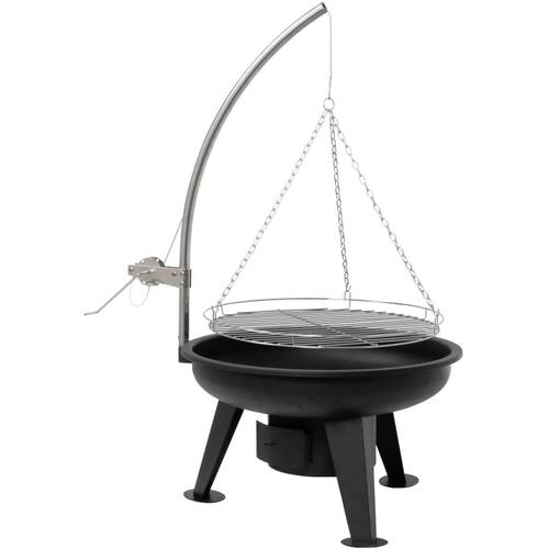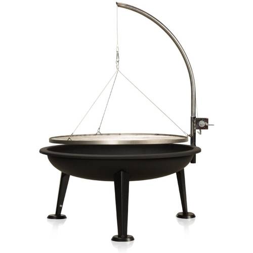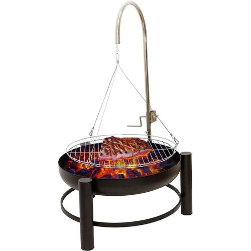 Eine Feuerschale kann als Feuerquelle eines Schwenkgrills mit Holz oder Grillkohle befeuert werden.