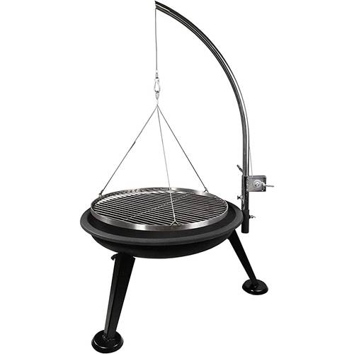 Beim Galgen-Schwenkgrill wird der Grillrost an einer Metallstange aufgehängt, die über der Feuerquelle schwingt. Die Stange steckt entweder direkt im Boden, in einem Stativ oder ist an einer Feuerschale befestigt. Diese Modelle sind robuster und bieten mehr Präzision, benötigen jedoch mehr Platz und sind meist schwerer.