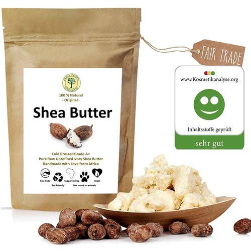reine Sheabutter ![]() | 100 % Sheabutter ist entweder raffiniert oder unraffiniert. Ist Ihre Sheabutter unraffiniert, dann ist die Nussbutter absolut naturbelassen und frei von zusätzlichen Duftstoffen, Ölen oder anderen Aromen. In dieser Form enthält die Sheabutter auch keine allergieauslösenden Substanzen und ist vor allem für Allergiker und Kleinkinder zu empfehlen. Unraffinierte Butter besitzt zudem eine gelbliche Farbe. Wurde die Sheabutter raffiniert, so lässt der gelbliche Farbton deutlich nach. Auch der Duft wird neutraler. Raffiniert bedeutet somit, dass die Butter bearbeitet wurde. Es handelt sich um kein 100% natürliches Produkt mehr, da chemische Stoffe bei der Bearbeitung ihre Anwendung finden könnten. Oftmals werden beide Naturprodukte ohne aufwendig gestaltete Verpackungsmaterialien verkauft. Das sieht zwar nicht so dekorativ aus, spart Ihnen aber auch zusätzliche Kosten. | |