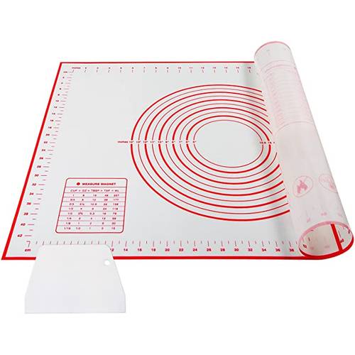 Sehr praktisch finden wir bei der auf diesem Bild gezeigten Silikon-Backmatte die Maßangaben für runde Teigplatten.
