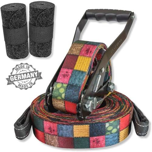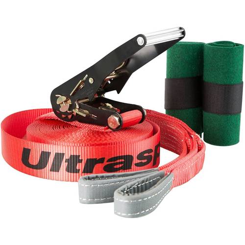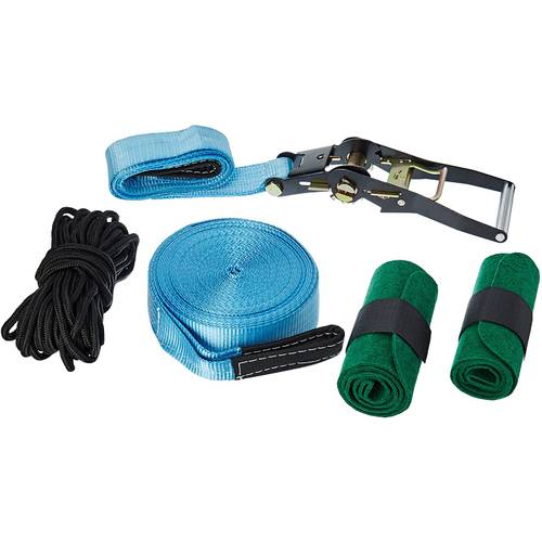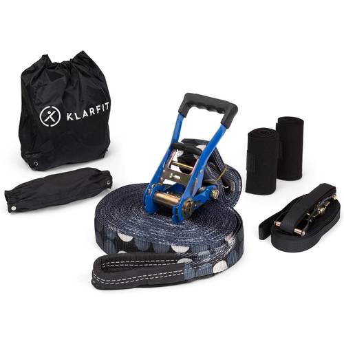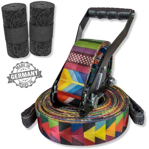 Zum Lieferumfang dieser Small-Foot-Slackline gehören Spanngurte, Filztücher, als Baumschutz und eine 15 m x 2,5 cm Hilfsleine, wie wir erfahren.