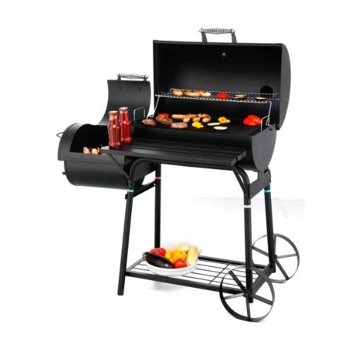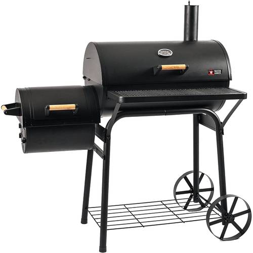 Hochwertigere Barbecue-Smoker verfügen über einen Räucherturm. Dann werden die Modelle meist als Chuckwagon bezeichnet. Hier befindet sich auf dem Deckel der Feuerbox auch eine Kochplatte, die beim BBQ zur Zubereitung von Soßen dienen kann.
