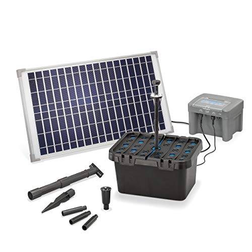 Eine Solar-Teichpumpe mit Akku ist nicht zwingend auf dauerhaften Sonnenschein angewiesen. Im Akku der Solar-Teichpumpe wird Energie gespeichert, die auch nachts oder an bewölkten Tagen für ein effektvolles Solar- Wasserspiel sorgt. Für den Einsatz der Solar-Teichpumpe bei Nacht und ohne Sonnenschein ist ein Akku in jedem Fall notwendig. | Solare Bachlauf- und normale Teichpumpen besitzen in der Regel keinen Akku und beziehen ihre Energie nur über das Solarmodul. Mit anderen Worten: Geht die Sonne unter oder kann sie sich keinen Weg durch die Wolkendecke bahnen, bleiben die Solar-Wasserspiele aus oder laufen nur auf Sparflamme. | |