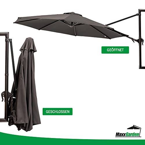 Die Bauart gleicht einem Ampelschirm mit Wandmontage. Das bedeutet, dass Sie den Sonnenschirm an der Wand befestigen und nicht wie gewohnt auf einen Standfuß montieren. Auch sitzt der Schirm nicht mittig auf einem Mast, sondern ist seitlich angebracht.