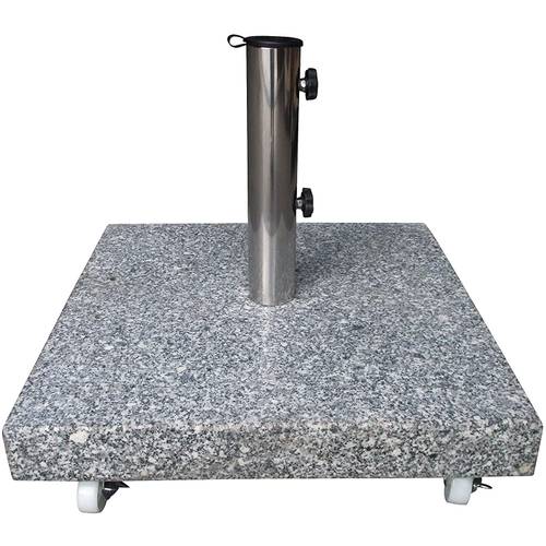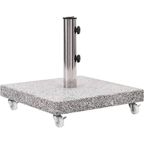 Hier sehen wir einen Bauhaus-Granit-Sonnenschirmständer mit Rollen, der stolze 50 kg wiegt.