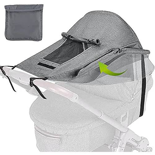 Tipp: Zur praktischen Handhabung können viele Kinderwagen-Sonnenverdecke aufgeschoben werden. So müssen Sie das Sonnensegel nicht vollständig entfernen, wenn Sie Augenkontakt zu Ihrem Baby suchen und das Sonnensegel kann dauerhaft am Kinderwagen montiert bleiben, damit Sie immer auf starke Sonne vorbereitet sind. Die besten Modelle haben außerdem ein Sichtfenster mit Moskitonetz, das bei Bedarf geöffnet werden kann.