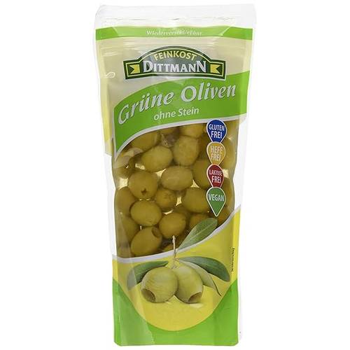 Die spanischen Oliven von Dittmann, die wir hier im Bild sehen sind in verschiedenen Sorten der Marke erhältlich.