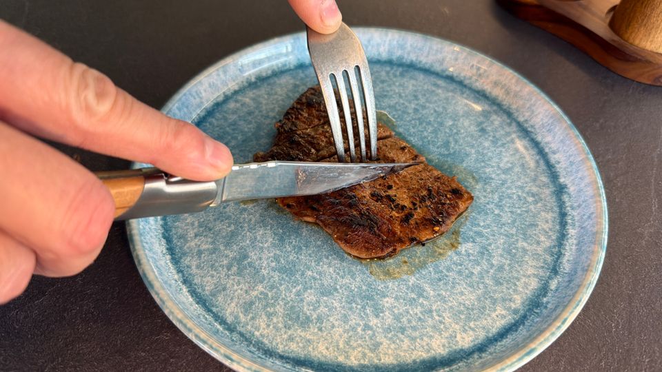 Im Steakmesser-Test braten wir Minutensteak in einer Eisenpfanne. Das Fleisch liegt serviert auf unserem Teller. Hier zeigt sich jedoch, dass das Messer von Wmf tatsächlich nicht so scharf ist. Das Fleisch wird nicht widerstandslos geschnitten und gleitet auch nicht sauber durch das Fleisch. Stattdessen haben wir das Gefühl, dass das Fleisch eher gerissen wird. Gerade im Vergleich zu anderen Steakmessern ist das eher enttäuschend.
