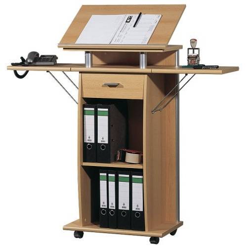 Zum einen gibt es Stehpulte, die einem Schreibtisch gleichen und mehrere Fächer und Ablagemöglichkeiten oder sogar Schränke unter der Arbeitsfläche haben. Der Unterschied zum Schreibtisch liegt in der Höhe, aber auch in der Breite – schließlich sollen Sie an Ihrem Stehpult stehend arbeiten können. Stehpulte sind in der Regel kompakter als Schreibtische zum Sitzen.