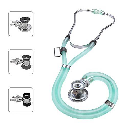 Schlauch | Der Schlauch kann ein- oder zweilumig sein. Klassische Modelle haben zwei getrennte Schläuche. Ein Doppelschlauch gilt außerdem als typisches Kennzeichen höherpreisiger Stethoskope. Ob eine getrennte Schallleitung aber tatsächlich akustische Vorteile und somit eine bessere Akkustik mit sich bringt, ist nicht belegt. Aus physikalischer Sicht sollte in einem kurzen Schlauch weniger Schall „verloren gehen“ als in einem längeren und daher für eine bessere Akkustik sorgen. Der Hersteller Littmann argumentiert aber, dass bei den geringen Längendifferenzen, die heutzutage bei Stethoskopschläuchen üblich sind, Unterschiede in der Schallakustik für das menschliche Ohr nicht hörbar sind. Schläuche haben heute eine Standardlänge von etwa 65-70 cm. |