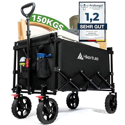 Der faltbare Bollerwagen von Wiltec ist mit Kunststoffrädern und einem Ladegewicht von 80 kg nutzbar. Er gilt in unserem Vergleich als sehr stabil und ist mit zusätzlichen Netztaschen ausgestattet. So können auch kleinere Utensilien gut verstaut werden.
