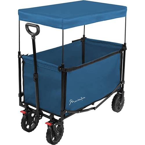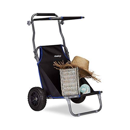 Einige Strandwagen sind mit einem Dach aus Stoff ausgestattet, das Sie vor direkter Sonneneinstrahlung schützt, wenn Sie Ihre klappbare Strandkarre als Stuhl verwenden möchten. Weiterhin befinden sich an der Rückseite einiger Strandwagen praktische Aufbewahrungstaschen, in denen loser Kleinkram verstaut werden kann.