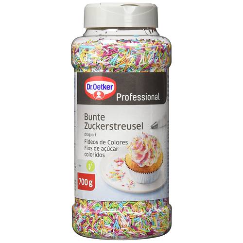 In der Bildmitte sehen wir hier Dr.-Oetker-Zucker-Streusel, die mit acht Farben wirklich bunt sind.